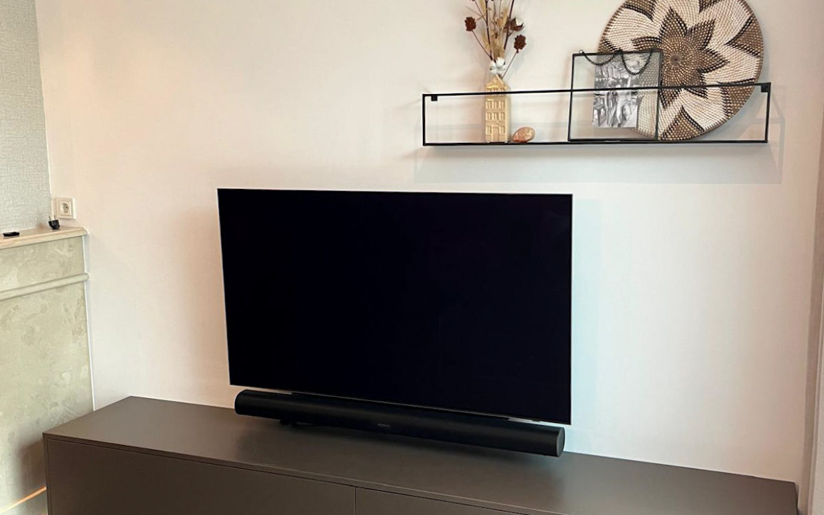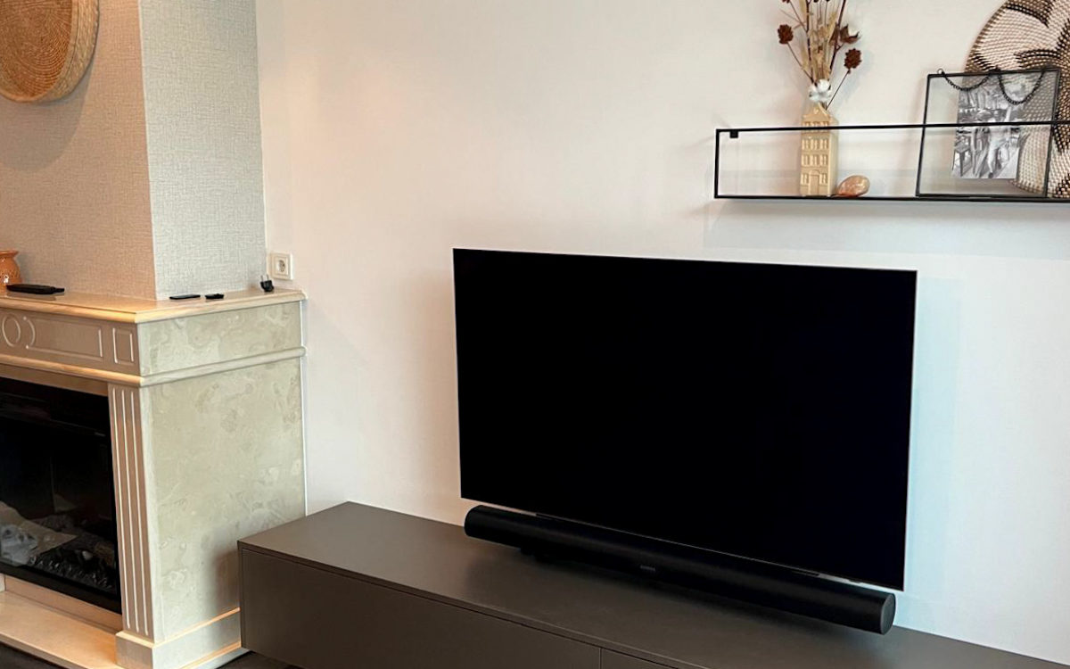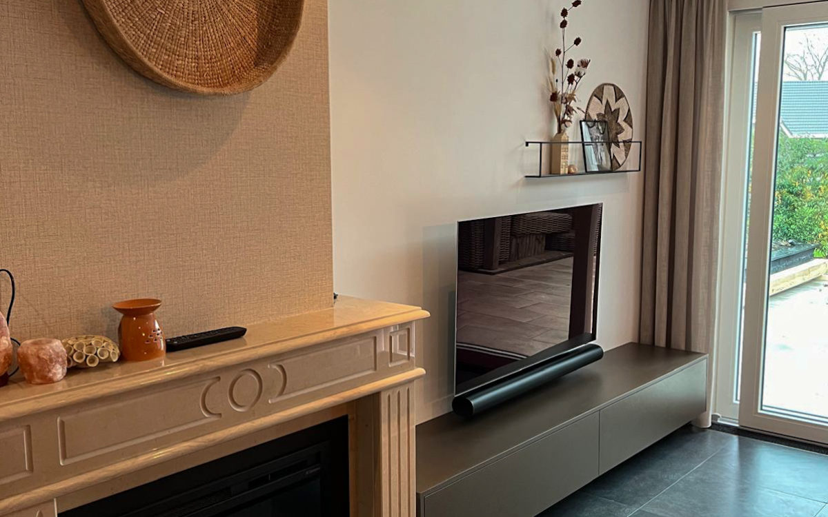 Om meer eenheid te creëren in de lange woonkamer, hebben we ook een bijpassend tv-meubel ontworpen. De accentkleur van de kast is teruggebracht in het tv-meubel, wat zorgt voor een subtiele herhaling en een harmonieus geheel.