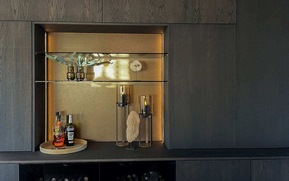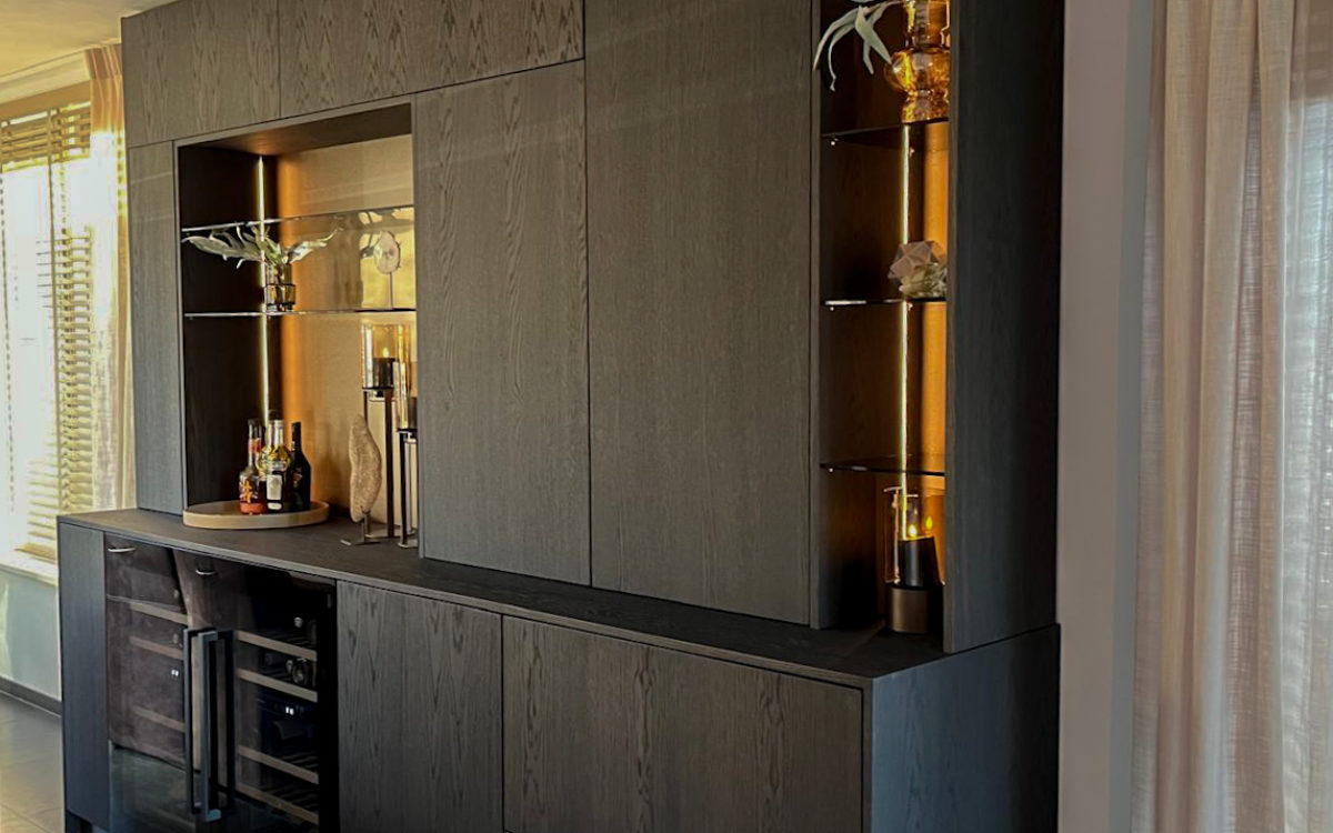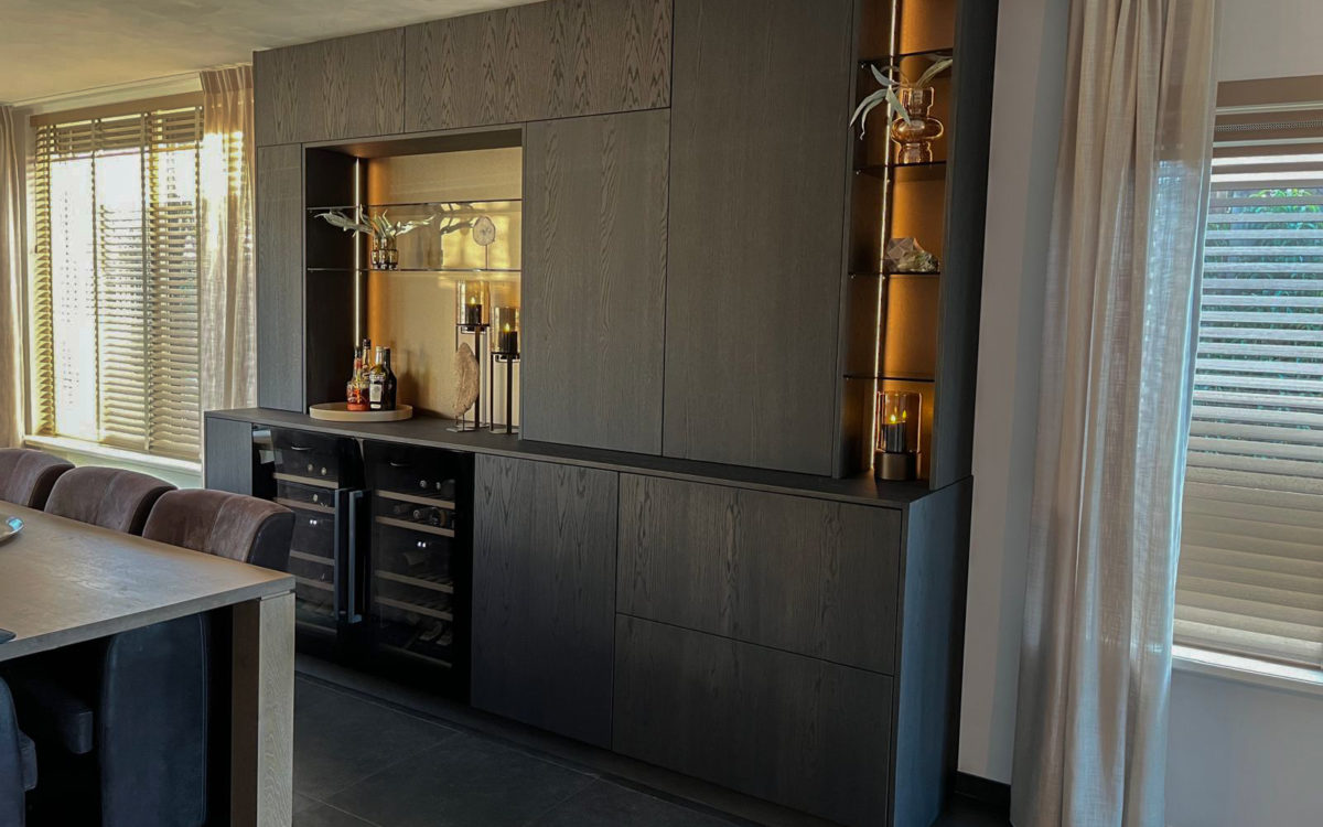 In het ontwerp hebben we wijnkoelkasten verwerkt om de wijnhoek praktisch én sfeervol te maken. De materialen zijn zorgvuldig op elkaar afgestemd, waardoor de kast naadloos integreert met de bestaande inrichting.